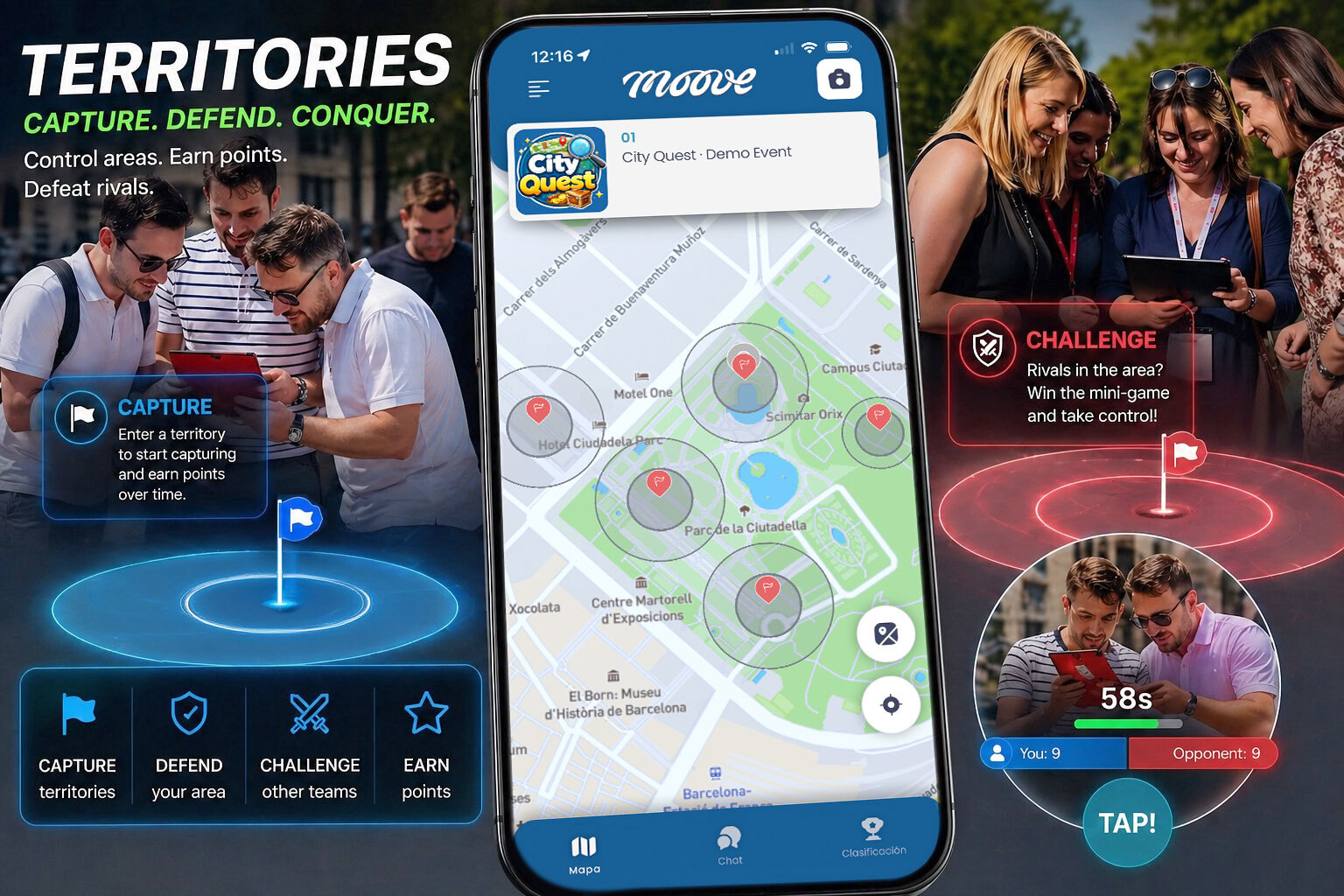 When two teams meet inside a territory, a conflict is triggered and resolved through mini-games like Rock-Paper-Scissors or Tug of War — creating high-energy moments during the event.